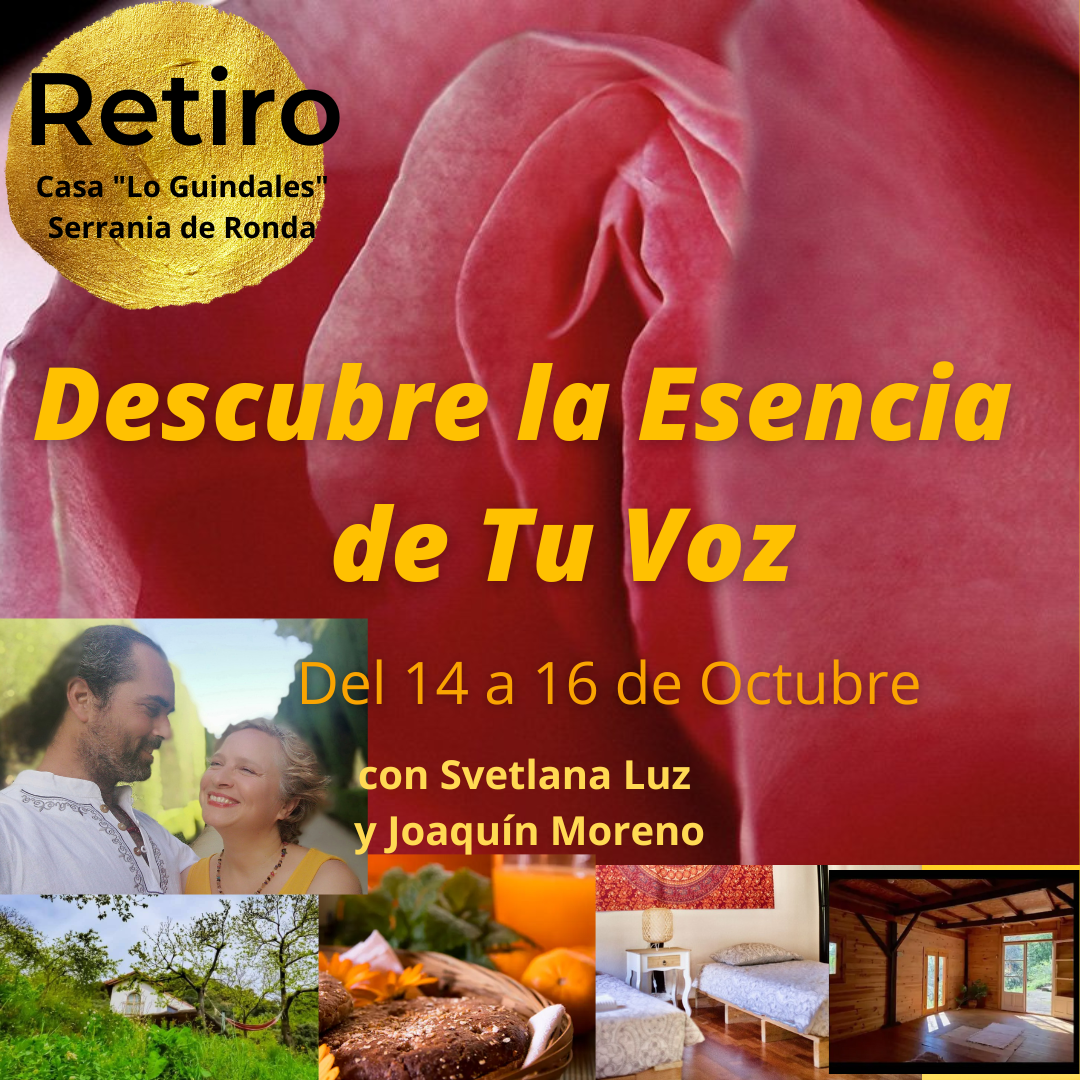 En este RETIRO INOLVIDABLE del 14 al 16 de OCTUBRE, te proponemos un Viaje hacia el Rescate de la ESENCIA DE TU VOZ, TU CANCIÓN, QUE SE EXPRESA LIBREMENTE. Para ello te ofrecemos todos nuestros tesoros – herramientas, que hemos recogido durante estos últimos 20 años: MOVIMIENTO CONSCIENTE, CHI KUNG, SANACIÓN CUANTICA, MEDITACIONES Y COMUNIONES EN EL CIRCULO, Y, POR SUPUESTO, EJERCICIOS DE VOZ, VIAJES CHAMANICOS, y mas…